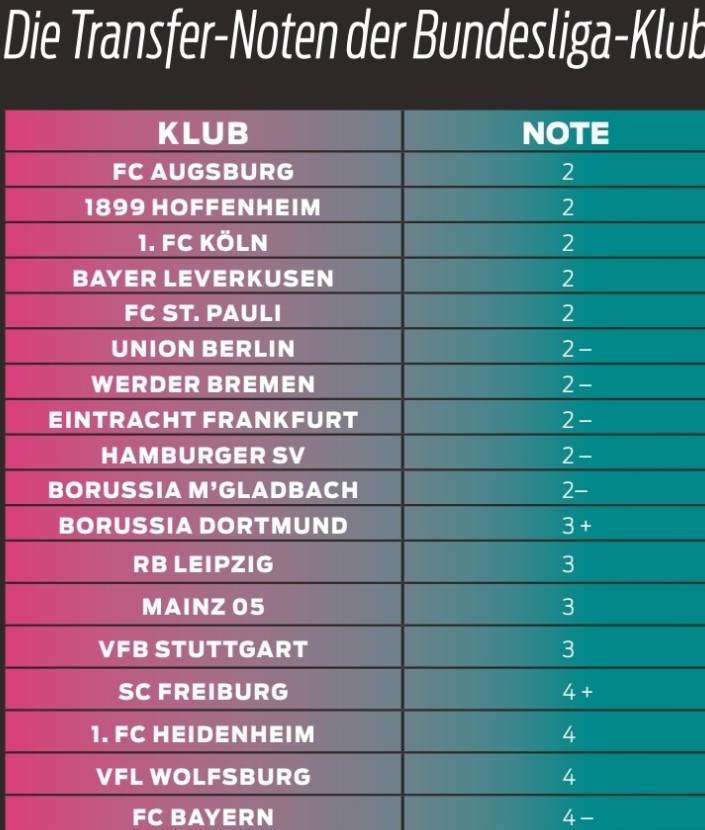图片报对德甲18队今夏转会运作评分:拜仁4-最低,多特3+
